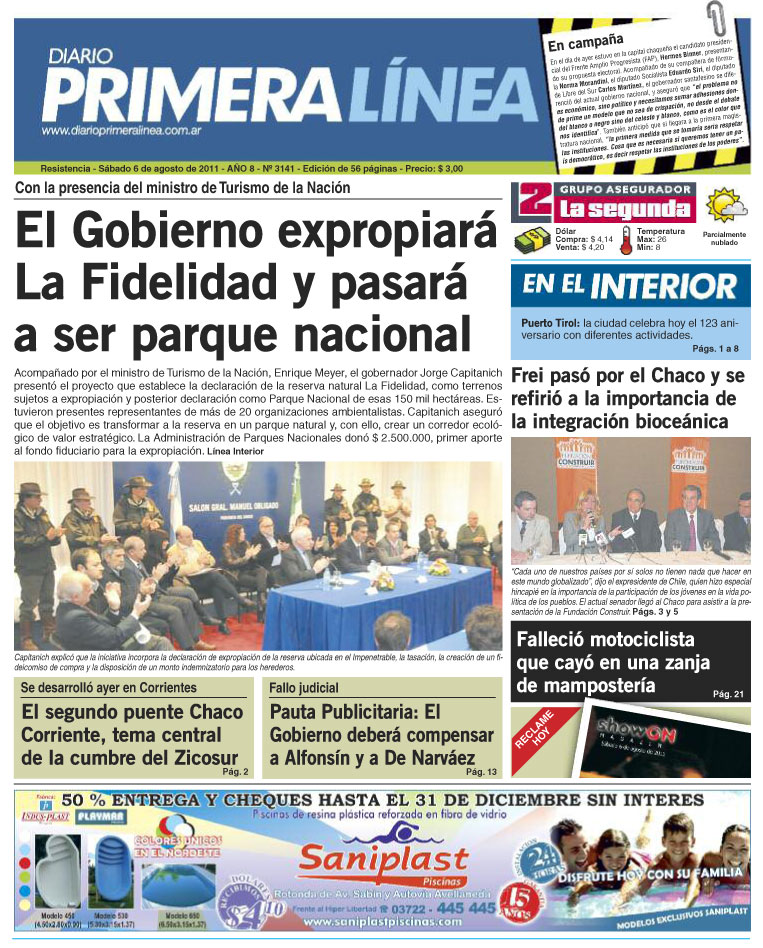 La Legislatura del Chaco sancionó con fuerza de ley la declaración de utilidad pública e interés social sujeto a expropiación de la Reserva de Recurso «La Fidelidad», que fuera creada por Ley 6833, con cargo a ser destinada Reserva Natural de Recursos. (Diciembre/2011)