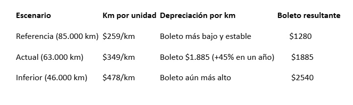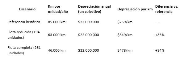 La depreciación expresada en el costo por kilómetro debería reflejar fielmente la realidad económica del sistema. Sin embargo, el uso de una cantidad de kilómetros por unidad que no condice con una operación normal del servicio desvirtúa completamente ese objetivo.