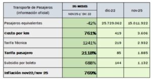 Esto implica $2.011 millones adicionales en esta hipótesis de cálculo, monto que fue trasladado directamente al sistema y explica, en gran medida, el aumento del 45% del boleto en un solo año.