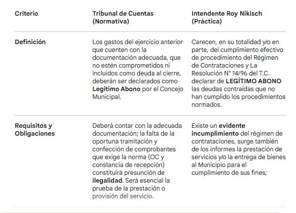 En el cuadro se observan las diferencias entre la definición del Tribunal de Cuentas y la aplicación municipal. Mientras el organismo exige documentación, la Intendencia utiliza el LA para salvar su ausencia.
