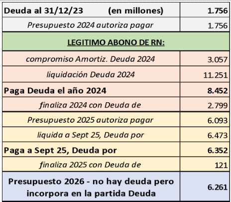 Para 2025, con una deuda de $2.799 millones, se prevé una partida de amortización de $6.093 millones. Y hacia el cierre del año se declara una deuda casi inexistente ($121 millones), mientras que el Presupuesto 2026 prevé $6.261 millones para deuda.