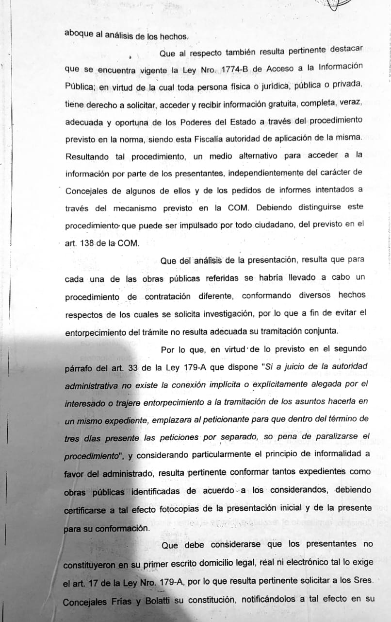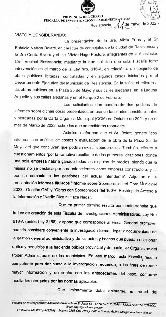 Por consiguiente, la FÍA resolvió dar curso a la investigación requerida por los concejales Bolatti y Frías, “a los fines de reunir mayor información y de contar con los antecedentes del caso, conforme las facultades otorgadas por las normas aplicables”, en virtud de las atribuciones otorgadas por la Constitución Provincial y la Carta Orgánica Municipal a todo ciudadano y ciudadana de poner en conocimiento del organismo hechos susceptibles de investigación, como resulta en el caso de las obras mencionadas anteriormente, por la envergadura de la inversión y la deducción de los estudios de costos realizados por el concejal, sobre la posible existencia de sobreprecios que en casos, superan el 100%.