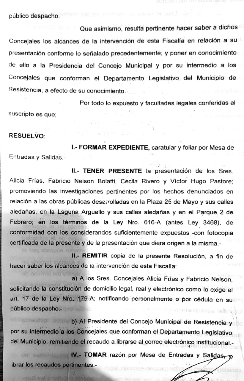 Los concejales de Resistencia Fabricio Bolatti y Alicia Frías, junto a la Dra. Cecilia Rivero y el Ing. Víctor Hugo Pastore, de la Asociación Civil Vecinal Resistencia, concretaron en el mes de abril, presentaciones en el Tribunal de Cuentas y la Fiscalía de Investigaciones Administrativas (FÍA), solicitando la intervención de los organismos sobre las obras que el Municipio ejecuta en los espacios verdes más importantes de la ciudad, a saber, la Plaza 25 de Mayo, la Laguna Argüello y el Parque 2 de Febrero.