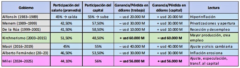 Lo que al ciclo anterior le llevó 12 años transferir en favor del asalariado (unos u$s 60.000 millones de dólares), al gobierno de Milei le bastaron solo dos años para destruirlo y devolverlo a las manos de los dueños del capital. La reforma laboral viene a «poner el sello» legal a este despojo, consolidando un esquema donde el trabajo es barato y el capital no tiene responsabilidades sociales. (Ver Cuadro 2)
