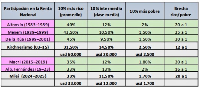 Históricamente, en Argentina, el 10% más rico de la población nunca recibió menos del 30% de la renta, mientras que el 10% más pobre jamás superó el 2,5%. En los escenarios de ajuste liberal, es la clase media la que cede su participación para alimentar la concentración en la cima de la pirámide. Esto y más podemos verlo en el siguiente cuadro.